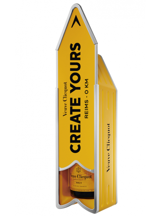 Veuve Clicquot Champagne Gift. A personalised Veuve Clicquot champagne gift set with engraved champagne bottle and a pair of champagne flutes in a satin lined gift box. For a limited period were embellishing the gift tins detachable arrow with our own grape seed-inspired design a nod to the origins of our exceptional champagnes wines and spirits.